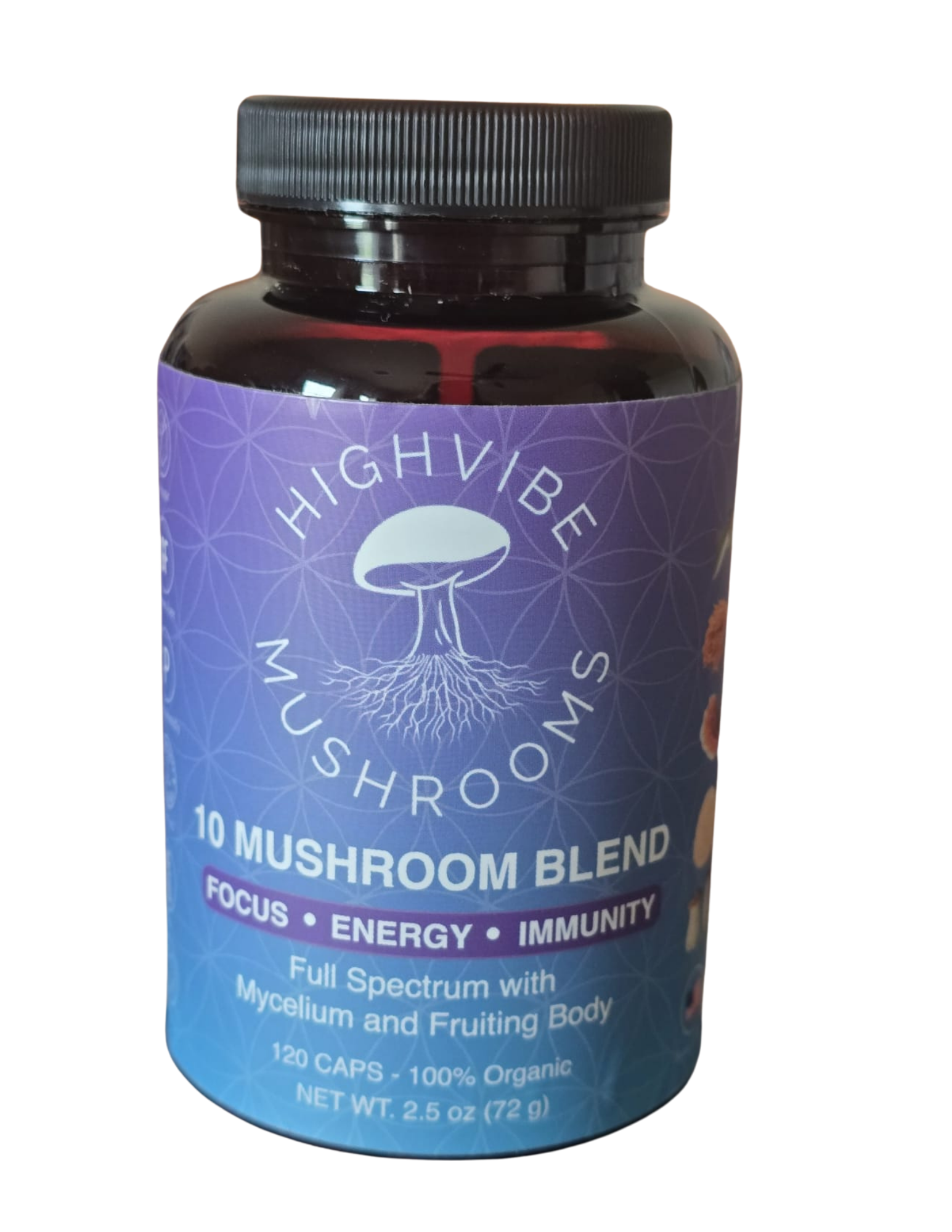 HIGHVIBE Mushrooms is a proprietary blend of 10 super strain species of medicinal mushrooms that boosts your immune system, improves focus & mental clarity & aids in detoxification.